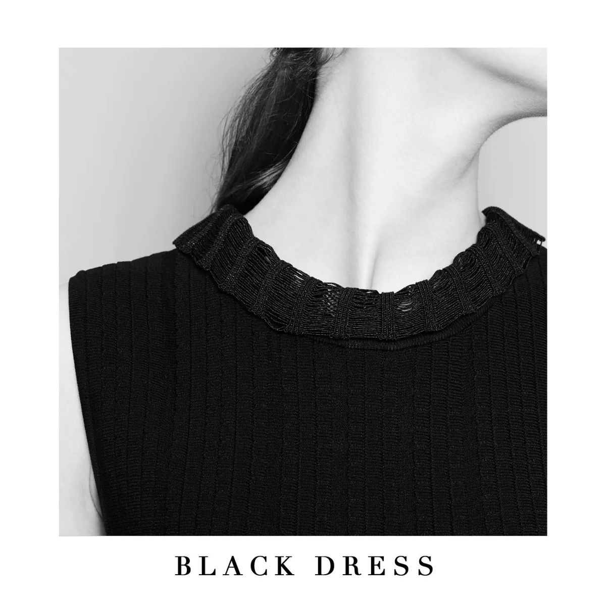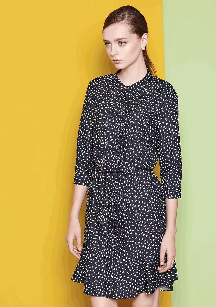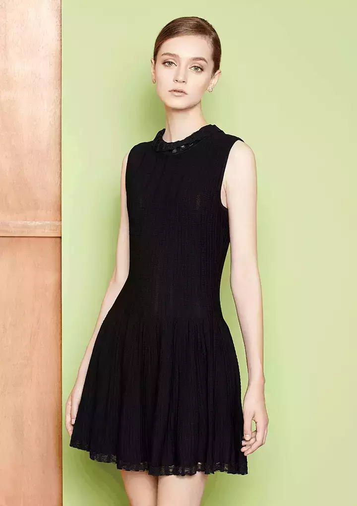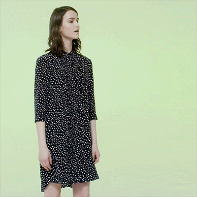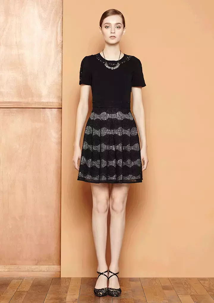 短袖的黑色裙装是粗手臂女性的福音,在领周和袖口做小细节的变化,能让整件裙装都熠熠生辉。裙摆的不规则条纹图案打破了一黑到底的大色块,让欢快的条纹雀跃于视线之内。