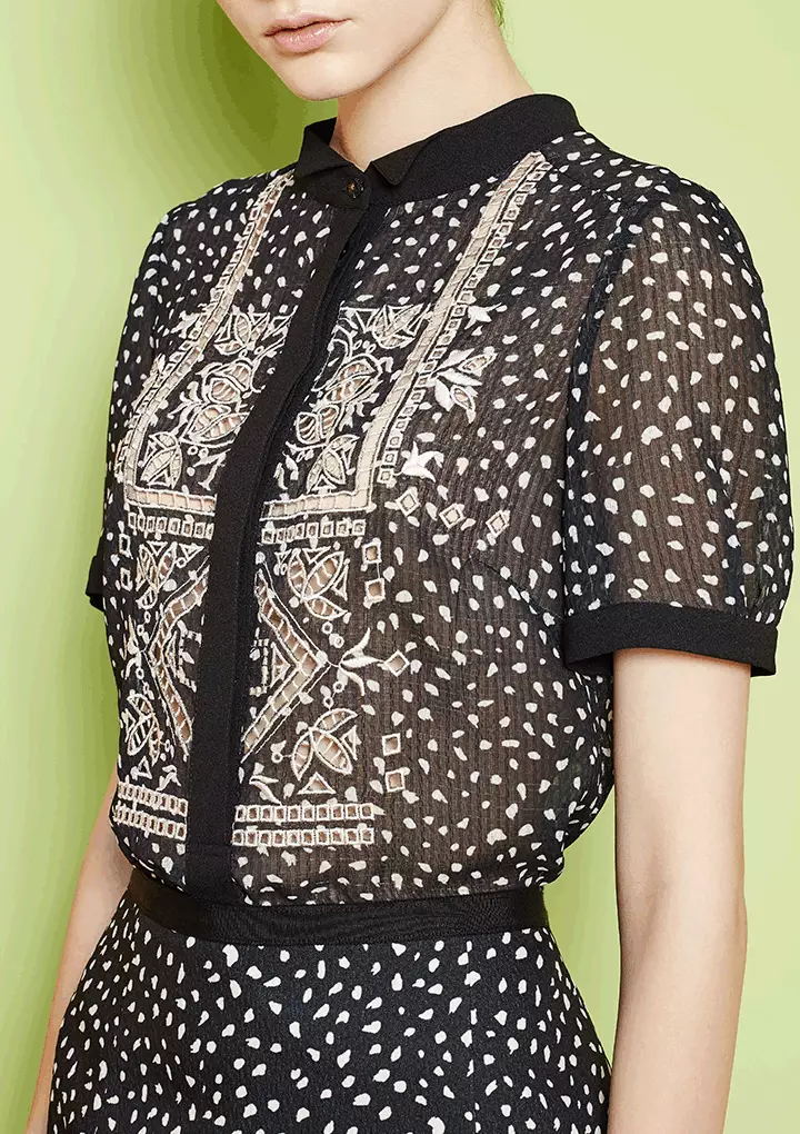 胸前镂空的复古图案让整件波点印花套装散发出极佳的艺术气息。搭配简约的同色系配饰让整体造型简约大气。