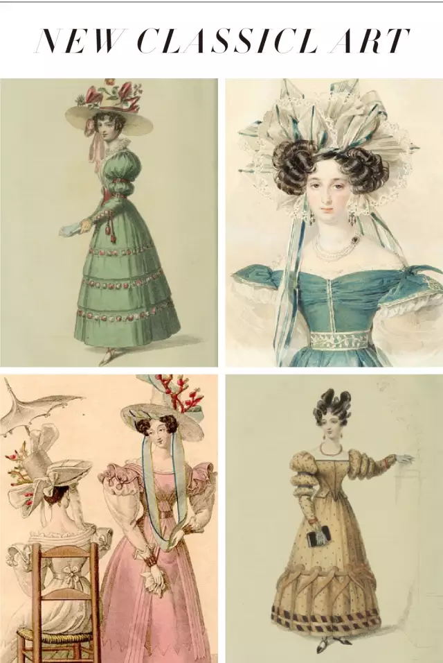这种强调自然、淡雅、节制的艺术风格,与古希腊罗马的题材形式结合所发展出来的礼服,也随即在法国大革命之后,跃升为服装款式的代表。特别是在女装方面。例如,以自然简单的款式,取代华丽而夸张的服装款式;又如,排除受约束、非自然的"裙撑架",等等。因此从1790年到1820年之间,所追寻的淡雅、自然之美,在服装史上被称为“新古典主义风格”。